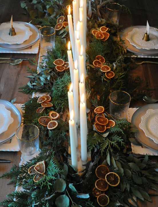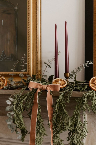 Fresh garland is always my go-to. Yes, it sheds. Yes, it needs misting. It’s so worth every minute. Drape it asymmetrically and weave in velvet ribbons, brass bells, taper candles, and my favorite – dried citrus. Keep it lush but not crowded. The visual movement is what makes it feel elevated.