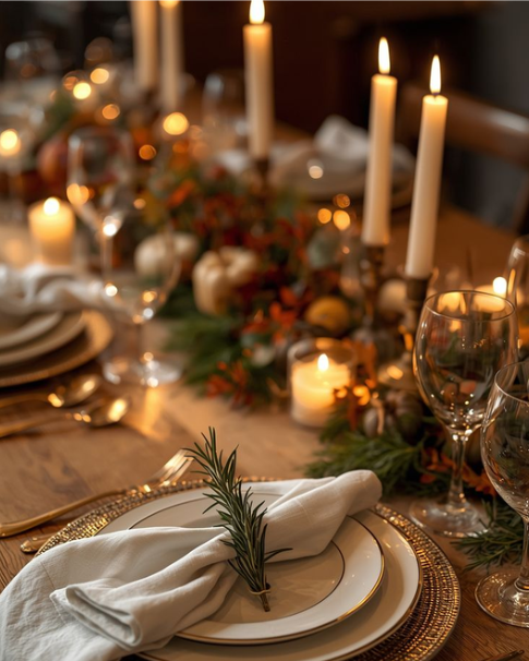Layering is the one styling move that never fails. Washed linen tablecloths, textural cotton or linen napkins, a frayed-edge runner they soften everything. Tie your napkins with a simple knot and tuck in sage, rosemary, or even a dried orange slice for a charming, unfussy detail.